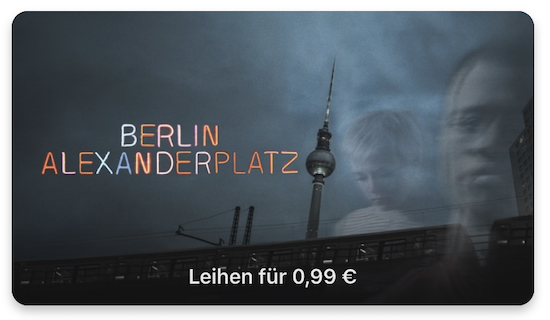 Apple hat zusätzlich zu seinem bereits liebgewonnenen "Movie Mittwoch" nun auch den "Blockbuster fürs Wochenende" ins Leben gerufen. Dabei wird jedes Wochenende ein ausgewählter Film aus dem iTunes-Sortiment für 24 Stunden zum Sonderpreis von nur € 0,99 in HD-Qualität zum Leihen angeboten. In dieser Woche handelt es sich um das deutsche Drama Berlin Alexanderplatz, das man zum Sonderpreis von € 0,99 erhält. Nachdem man den Leih-Film geladen hat, kann er innerhalb von 30 Tagen angeschaut werden. Wie immer bei geliehenen Filmen aus dem iTunes Store gilt: Hat man hiermit einmal begonnen, muss man ihn innerhalb von 48 Stunden beenden.