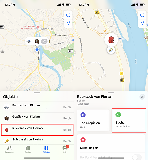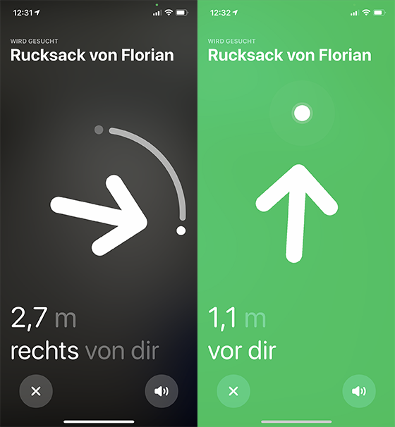 - Anschließend wird der entsprechende AirTag lokalisiert und auf dem Display tauchen entsprechende Richtungsanweisungen und die Entfernung zum AirTag auf. Zudem erfährt man auch, wenn sich der AirTag auf einer anderen Etage befindet.