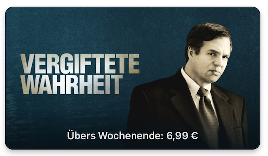 Darüber hinaus lässt sich das Drama Vergiftete Wahrheit nur über das Wochenende zum Preis von € 6,99 käuflich im iTunes Store erwerben. Einmal gekaufte Filme lassen sich jederzeit erneut aus dem iTunes Store herunterladen und sind auf allen verbundenen Geräten uneingeschränkt nutzbar.