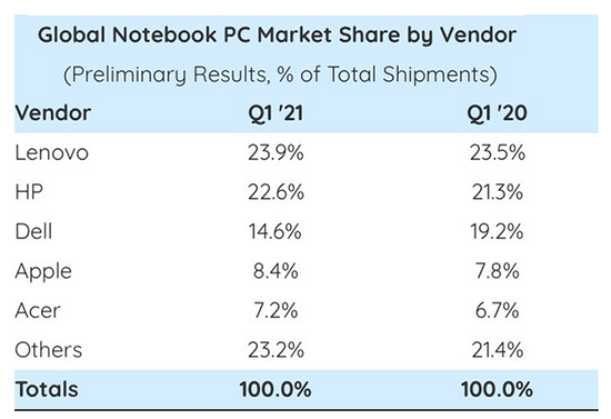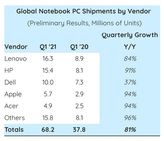 Der Anstieg fällt vor allem deswegen eher gering aus, da auch die anderen Hersteller, allen voran Lenovo und HP starke Zahlen hinlegten und vor allem die Chromebooks dieser Hersteller im Bildungsbereich gefragt sind. So wuchs der gesamte Notebook-Markt im Jahresvergleich um 81%. Es wird erwartet, dass die MacBook-Zahlen auch weiterhin stark sein werden, da Apple später im Jahr angeblich noch ein komplett neues MacBook Air in bunten Farben und ein neues 16" MacBook Pro mit Apple Silicon Prozessor auf den Markt bringen wird.