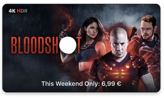 Darüber hinaus lässt sich der Action-Kracher Bloodshot mit Vin Diesel nur über das Wochenende zum Preis von € 6,99 käuflich im iTunes Store erwerben. Einmal gekaufte Filme lassen sich jederzeit erneut aus dem iTunes Store herunterladen und sind auf allen verbundenen Geräten uneingeschränkt nutzbar.