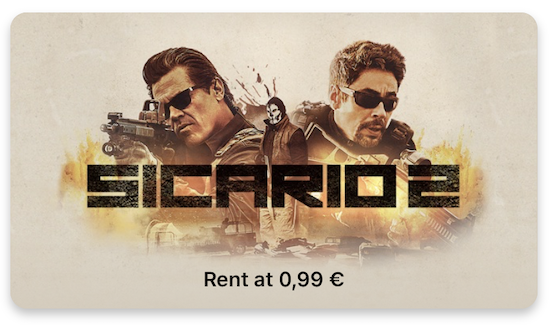 Apple hat zusätzlich zu seinem bereits liebgewonnenen "Movie Mittwoch" nun auch den "Blockbuster fürs Wochenende" ins Leben gerufen. Dabei wird jedes Wochenende ein ausgewählter Film aus dem iTunes-Sortiment für 24 Stunden zum Sonderpreis von nur € 0,99 in HD-Qualität zum Leihen angeboten. In dieser Woche handelt es sich um den Thriller Sicario 2 mit Benicio Del Toro, den man zum Sonderpreis von € 0,99 erhält. Nachdem man den Leih-Film geladen hat, kann er innerhalb von 30 Tagen angeschaut werden. Wie immer bei geliehenen Filmen aus dem iTunes Store gilt: Hat man hiermit einmal begonnen, muss man ihn innerhalb von 48 Stunden beenden.