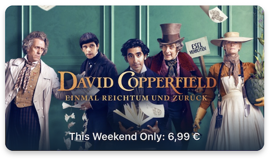 Darüber hinaus lässt sich die Komödie David Copperfield - Einmal Reichtum und zurück nur über das Wochenende zum Preis von € 6,99 käuflich im iTunes Store erwerben. Einmal gekaufte Filme lassen sich jederzeit erneut aus dem iTunes Store herunterladen und sind auf allen verbundenen Geräten uneingeschränkt nutzbar.