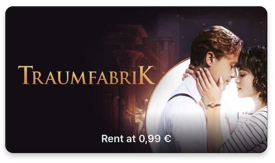 Apple hat zusätzlich zu seinem bereits liebgewonnenen "Movie Mittwoch" nun auch den "Blockbuster fürs Wochenende" ins Leben gerufen. Dabei wird jedes Wochenende ein ausgewählter Film aus dem iTunes-Sortiment für 24 Stunden zum Sonderpreis von nur € 0,99 in HD-Qualität zum Leihen angeboten. In dieser Woche handelt es sich um den deutschen Liebesfilm Traumfrabrik, den man zum Sonderpreis von € 0,99 erhält. Nachdem man den Leih-Film geladen hat, kann er innerhalb von 30 Tagen angeschaut werden. Wie immer bei geliehenen Filmen aus dem iTunes Store gilt: Hat man hiermit einmal begonnen, muss man ihn innerhalb von 48 Stunden beenden.