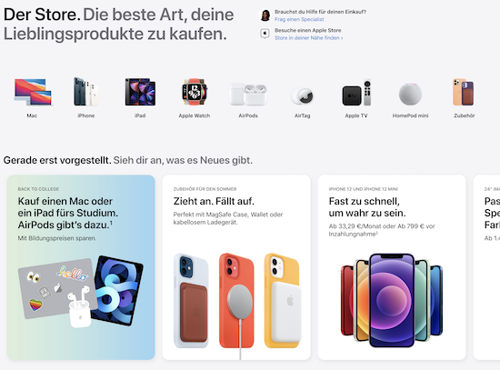 Das Design präsentiert sich angelehnt an die Apple Store App vom iPhone oder iPad und präsentiert neben den verschiedenen Produktbereichen auch Verkaufsaktionen und den direkten Kontakt zum Support. Die horizontal scrollende Navigation macht allerdings eher den Eindruck, als lasse sie sich auf einem Mobilgerät sinnvoller nutzen als am Rechner. Sei es drum, der Schritt zurück zum dedizierten Store-Bereich auf der Apple-Webseite ist meiner Meinung nach mehr als willkommen!