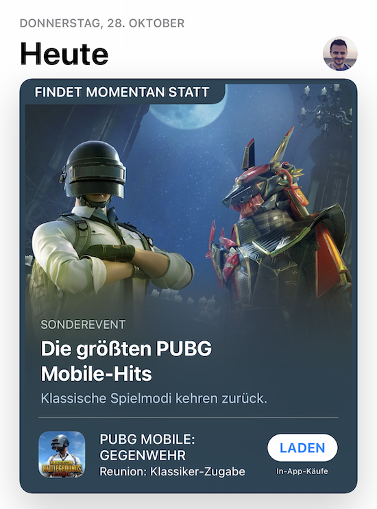 In der vergangenen Woche hatte Apple sie gegenüber den Entwicklern bereits angekündigt, nun ist der offizielle Startschuss im AppStore erfolgt. Die Rede ist von den sogenannten "In-App Events". Als Beispiele für diese neue AppStore-Funktion nennt Apple Spielewettbewerbe, Filmpremieren, Livestreams oder Fitness-Challenges, die innerhalb der Apps inbestimmten Zeiträumen durchgeführt werden und die nun von den Entwicklern direkt über den AppStore beworben werden können. Passend zum Start der Verfügbarkeit tauchen auch bereits die ersten dieser Events im AppStore auf, wie beispielsweise die Rückkehr der klassischen Spielmodi in PUPG.