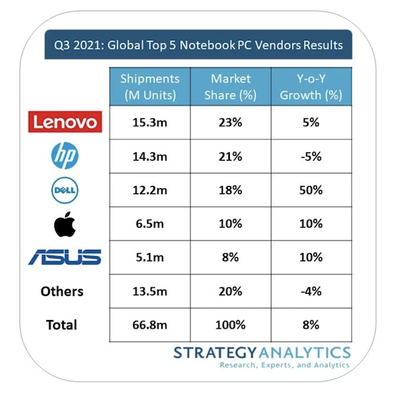 Apple selbst gibt schon länger keine konkreten Verkaufszahlen zu seinen Produkten mehr bekannt, sondern lediglich den damit genereierten Umsatz. Insofern müssen wir uns darauf verlassen was die verschiedenen Analysten an Zahlen ermitteln, so wie es aktuell Strategy Analytics für die MacBooks getan hat. Demnach hat Apple im dritten Quartal des Jahres 6,5 Millionen Laptops verkauft, vor allem angetrieben durch das vor ziemlich genau einem Jahr vorgestellte M1 MacBook Air. Damit würde Apple in der Rangliste der Hersteller mit den meisten Verkäufen auf dem vierten Rang liegen und einen Marktanteil von 10% für sich reklamieren. Vor Apple können sich Lenovo mit 15,3 Millionen verkauften Geräten und 24% Marktanteil, sowie HP und Dell platzieren. Insgesamt wechselten im dritten Quartal 66,8 Millionen Notebooks den Besitzer. Die Zahl hätte sogar noch höher liegen können, hätte nicht die weltweite Chipkrise für Lieferprobleme gesorgt.