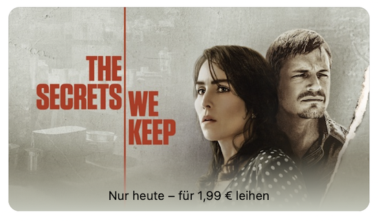 Auch heute hat Apple wieder den sogenannten "Movie Mittwoch" ausgerufen. Dabei wird jeden Mittwoch ein ausgewählter Film aus dem iTunes-Sortiment für 24 Stunden zum Sonderpreis von nur € 1,99 in HD-Qualität zum Leihen angeboten. In dieser Woche handelt es sich dabei um den Thriller The Secrets We Keep - Schatten der Vergangenheit, den man zum Sonderpreis von € 1,99 erhält. Nachdem man den Leih-Film geladen hat, kann er innerhalb von 30 Tagen angeschaut werden. Wie immer bei geliehenen Filmen aus dem iTunes Store gilt: Hat man hiermit einmal begonnen, muss man ihn innerhalb von 48 Stunden beenden.