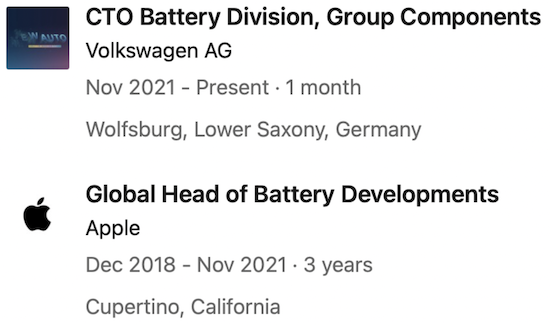 Ahn wechselte im Dezember 2018 von Samsung zu Apple und übernahm dort die Position des "Global Head of Battery Development". Als solcher war er zwar offiziell für die Entwicklung der Akku-Technologie für sämtliche Apple-Produkte zuständig, man kann allerdings davon ausgehen, dass dies auch für das geplante Apple Car gilt. Dies lässt sich auch an seinem Wechsel zu VW ablesen. Inzwischen hat auch Ahn selbst seinen neuen Arbeitgeber auf seinem LinkedIn-Profil bestätigt.