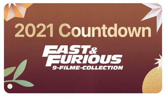 Das Weihnachtsfest liegt inzwischen hinter uns und vor allem für Kinder bedeutete die Zeit bis dahin im Dezember jeden Tag ein bisschen Freude beim Öffnen der Türen des Adventskalenders. Auch Apple bietet in diesem Jahr wieder eine Dezember-Aktion an und weitet diese gar auf 31 Tage, also bis zum Ende des Monats aus. Unter dem Motto "2021 Countdown" wird man dabei jeden Tag mit einem neuen Inhalt aus dem Film-Bereich des iTunes Store zum Sonderpreis beschenkt. Heute erhält man auf diese Weise die Fast & Furious Collection, bestehend aus allen neun Teilen der Reihe für nur € 29,99 zu kaufen.
