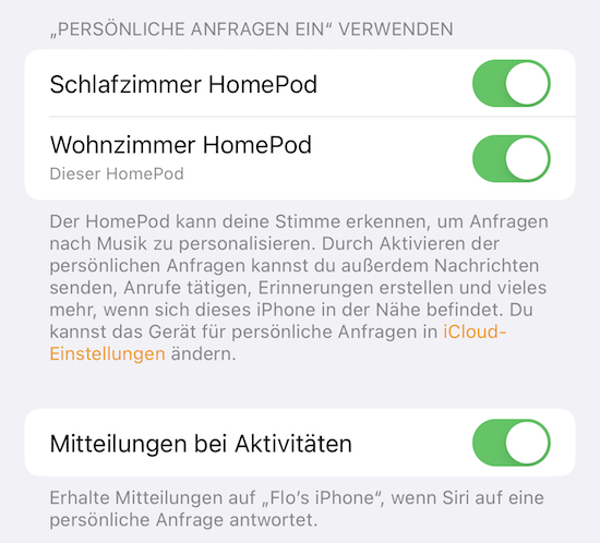 Wurde der Versuch, die "Persönlichen Anfragen" zu aktivieren bei einer deutschen Spracheinstellung bislang stets mit der Meldung quittiert, dass dies in der aktuellen Sprache nicht möglich sei, fügt sich die Aktivierung des Schalters in den HomePod-Einstellungen in der Home-App seit dem gestern freigegebenen Release Candidate von iOS 15.2 klaglos.