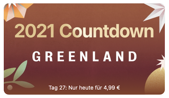 Das Weihnachtsfest rückt mal wieder näher und während sich bei manchen Freude und Besinnlichkeit breit macht, kommt bei anderen eher Hektik beim Weihnachtsshopping auf. Vor allem für Kinder bedeutet die Zeit bis zum Weihnachtsfest jeden Tag ein bisschen Freude beim Öffnen der Türen des Adventskalenders. Auch Apple bietet in diesem Jahr wieder eine Dezember-Aktion an und weitet diese gar auf 31 Tage, also bis zum Ende des Monats aus. Unter dem Motto "2021 Countdown" wird man dabei jeden Tag mit einem neuen Inhalt aus dem Film-Bereich des iTunes Store zum Sonderpreis beschenkt. Heute erhält man auf diese Weise die Naturkatastrophen-Action Greenland mit Gerard Butler für nur € 4,99 zu kaufen.