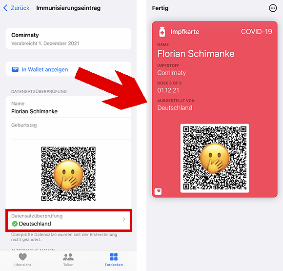 Mit dem seit der vergangenen Woche im Betastadium befindlichen iOS 15.4 wird es auch möglich sein, ein in der EU ausgestelltes COVID-Impfzertifikat zu Apples Health-App hinzuzufügen und auch im iOS Wallet zu hinterlegen. Die Vorabversion ermöglichte bereits das Speichern des Impfnachweises in der Health-App, verweigerte jedoch das Hinzufügen zum Wallet mit dem Hinweis, dass die Impfkarte "zum jetzigen Zeitpunkt nicht zu Wallet hinzugefügt werden kann". Innerhalb der Health-App erschien zudem ein Hinweis, dass hierzu wohl noch eine wie auch immer geartete Überprüfung stattfinden muss. Die hierfür benötigte Infrastruktur wurde in den vergangenen Tagen offenbar serverseitig im Hintergrund geschaffen, denn seit heute wird mein Impfzertifikat in der Health-App als gültig markiert und lässt sich von dort aus mit einem einfachen Tap auch als "Impfkarte" ins Wallet verfrachten. Vor allem in Kombination mit der ebenfalls mit iOS 15.4 kommenden Möglichkeit, sein iPhone (12 und neuer) auch mit getragener Maske zu entsperren, ist dies ein echter Komfortgewinn.