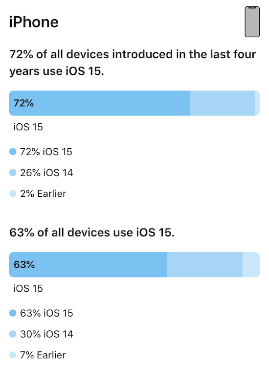 In neuer grafischer Aufbereitung als Balkendiagramm hat Apple die ersten offiziellen Zahlen zur Verbreitung von iOS 15 veröffentlocht. Demzufolge befindet sich die aktuellste iOS-Version inzwischen auf 72% der in den vergangenen vier Jahren auf den Markt gekommenen iPhones. 26% der Nutzer dieser Geräte sind noch mit iOS 14 unterwegs, die restlichen 2% mit einer älteren Version. Zählt man auch ältere iPhones mit, kommt iOS 15 auf 63%, iOS 14 auf 30% und ältere Versionen auf 7%. Apple unterscheidet nach verschiedenen Gerätegruppen, da sich natürlich auch noch Geräte in Umlauf befinden, auf denen iOS 15 überhaupt nicht installiert werden kann. Allerdings bleibt festzustellen, dass sich iOS 15 nicht so schnell verbreitet, wie dies bei iOS 14 noch der Fall war. Dieses System kam bereits im Dezember nach seiner Veröffentlichung auf 81%, bei iOS 13 waren es Ende Januar 2020 immerhin bereits 77%.