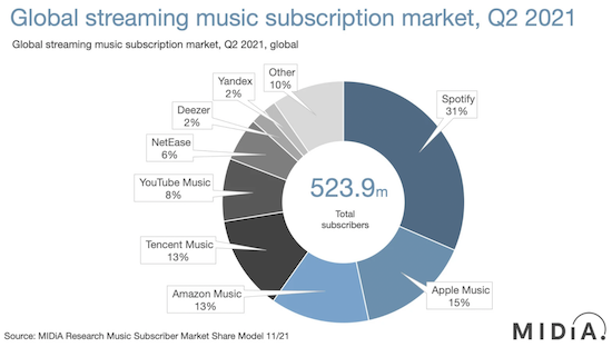 Offizielle Nutzerzahlen zu Apple Music wurden schon länger nicht mehr bekanntgegeben. Dafür springen nun die Analysten von MIDiA Research in die Bresche und schlüsseln in einem neuen Bericht die weltweiten Marktanteile und Nutzer von verschiedenen Musik-Streamingdiensten für das (zugegebenermaßen schon länger zurückliegende) zweite Quartal 2021 auf. Während Apple Music hier immerhin auf den zweiten Platz kommt, liegt man nach wie deutlich hinter dem nach wie vor regierenden Platzhirschen Spotify. Insgesamt wuchs die Zahl bei den Musik-Streamingdiensten im genannten Zeitraum im Jahresvergleich um 26,4% auf insgesamt 523,9 Millionen Nutzer. Hiervon entfallen 78 Millionen auf Apple Music, was einem Anteil von 15% entspricht.
