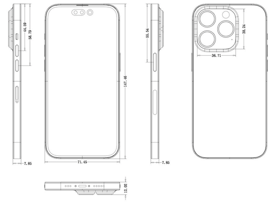 Aus den Zeichnungen geht hervor, dass das iPhone 14 Pro Max Maße von 77,58 mm in der Breite und 160.7 mm in der Höhe aufweisen wird. Zum Vergleich: Das iPhone 13 Pro Max ist 78,1 mm breit und 160,8 mm hoch. Mit 7,85 mm würde das neue High-End iPhone allerdings leicht dicker werden als sein Vorgänger, welcher hier 7,65 mm misst. Nachdem das iPhone 13 Pro und das iPhone 13 Pro Max bereits einen deutlich größeren Kamerabuckel aufwiesen als die iPhone 12 Pro Modelle, scheint sich zudem auch hier dieser Trend zu wiederholen. Misst der "Bump" beim iPhone 13 Pro Max noch 3,60 mm in der Höhe, sollen es beim iPhone 14 Pro Max den Schemazeichnungen zufolge satte 4,17 mm werden. Auch die sonstigen Abmesseungen des Buckels würden weiter wachsen und zwar von 35,01 mm auf 36,73 mm in der Breite und von 36,24 mm auf 38,21 in der Höhe.