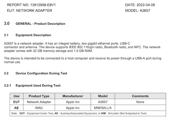 Zwar sind keine weiterführenden Details bekannt, da Apple bei der FCC die Geheimhaltung beantragt hat. Allerdings geht aus dem Zulassungsantrag hervor, dass das Produkt die interne Bezeichnung "A2657" trägt, und über zwei Gigabit Ethernet Anschlüsse, WiFi, Bluetooth, einen USB-C Anschluss und NFC verfügt. Außerdem besitzt das Gerät einen internen Speicher von 32 GB und 1,5 GB Arbeitsspeicher. Eine zweite Version hingegen verfügt über einen Lightning-Anschluss statt USB-C und lediglich 1 GB Arbeitsspeicher. Die FCC testet das unbekannte Zubehör den Dokumenten zufolge mit einem MacBook Pro und einem iMac. Weitere Details sind derzeit wie gesagt nicht bekannt, da die Geheimhaltungsklausel noch bis November gilt.