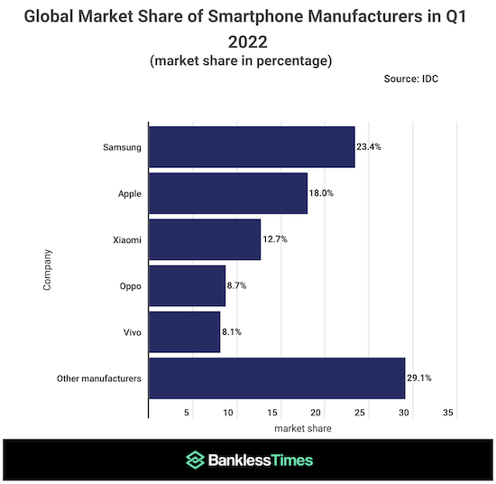 In ziemlich genau zwei Monaten dürfte Apple dies diesjährige iPhone-Generaion vorstellen, die wohl unter anderem mit einem abermals verbesserten Kamerasystem aufwarten wird. Dennoch erfreut sich auch das iPhone 13 nach wie vor großer Beliebtheit. Im Ranking der weltweit erfolgreichsten Smartphone-Hersteller im ersten Quartal des Jahres musste sich Apple dann den Daten der BanklessTimes zufolge auch nur dem großen Konkurrenten Samsung geschlagen geben. Während Apple demnach 56 Millionen iPhones verkaufte und damit auf 18% Marktanteil kommt, waren es bei Samsung im selben Zeitraum 73 Millionen Geräte und 23,4% Marktanteil. Im Jahresvergleich konnte Apple damit 2,2% zulegen, während der gesamte Smartphonemarkt um 8,9% nachgab. Die Top 5 komplettieren die chinesischen Hersteller Xiaomi, Oppo und Vivo.