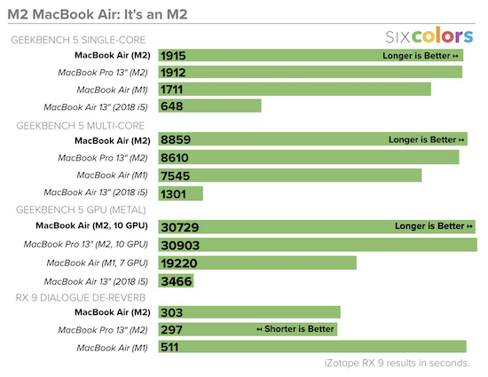 Selbstverständlich bringt die neue Generation aber auch einen spürbaren Geschwindigkeitsschub mit, den die Kollegen von Six Colors in der folgenden Grafik sichtbar gemacht haben.