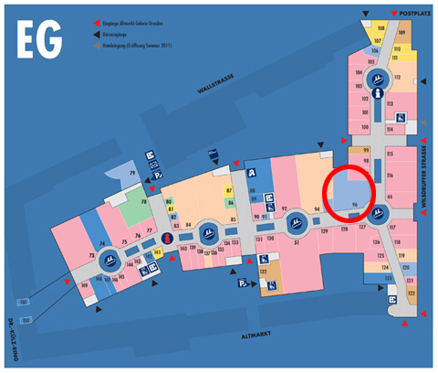 iFun konnten bereits vor einigen Tagen Bilder aus dem Inneren des Stores präsentieren. Heute nun versorgt mich Philipp (vielen Dank dafür!) mit weiteren Bildern der inzwischen so gut wie abgeschlossenen Arbeiten am Innenausbau des Ladenlokals. Erwartungsgemäß wird auch der Store in Dresden nicht viel anders aussehen, als die restlichen Apple Stores, inklusive weiträumiger Ausstellungsflächen und Genius Bar. Mit den Bildern ist nun auch der genaue Standort innerhalb der Altmarkt Galerie gelüftet. Der Store befindet sich in prmonenter Lage im Erdgeschoss auf einem "Eckgrundstück" (96) zwischen Swarovski und Olymp (siehe auch Lageplan im Anschluss oder auf den