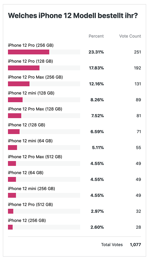 Mitte vergangenen Monats hatte Apple das mit Spannung erwartete iPhone 12 vorgestellt, heute lassen sich ab 14:00 Uhr deutscher Zeit mit dem iPhone 12 mini und dem iPhone 12 Pro Max die beiden noch verbliebenen Modelle vorbestellen, die dann auch zum offiziellen Verkaufsstart in einer Woche bei den ersten Frühbestellern ankommen dürften. Selbstverständlich wird heute zudem auch der HomePod mini in die Vorbestellphase gehen. Erstmals hat sich Apple dabei in diesem Jahr dazu entschieden, gleich vier neue Varianten des iPhone auf den Markt zu werfen. Dabei hat man nicht nur die Wahl zwischen drei verschiedenen Displaygrößen, sondern auch zwischen verschiedenen Leistungsdaten, Farben und Speicherkapazitäten. Bevor die nächste Vorbestellphase um 14:00 Uhr im Apple Online Store beginnt, ist es daher Zeit nochmal meine kleine Umfrage aufzuwärmen, um einen Trend zu ermitteln, welches denn wohl das beliebteste der neuen iPhones in diesem Jahr ist. Ganz unten findet ihr den aktuellen Zwischenstand von heute Morgen. Los gehts...