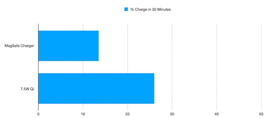 Grundsätzlich ist der MagSafe Charger so designt, dass er ein iPhone 12 mit maximal 15 Watt betanken kann. Mit einem älteren iPhone kommt dies allerdings nicht zum Tragen. In einem Test mit einem in den Flugmodus versetzten iPhone XS Max mit 1% restlicher Akkulaufzeit war der MagSafe Charger in der Lage, das Gerät auf gerade einmal 13% in einer halben Stunde aufzuladen. Zum Vergleich: Mit einem herkömmlichen 7,5 Watt Qi-Ladegerät kommt man in einer halben Stunde auf 25% Akkulaufzeit. Hat man sich also gegen die Anschaffung eines iPhone 12 entschieden, kann man auch getrost die Finger von einem MagSafe Charger lassen.