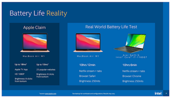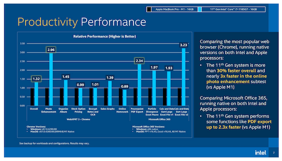 Beispielsweise erklärt Intel, dass der Export einer PowerPoint Präsentation ins PDF-Format auf einem Windows-Laptop mit einem Core i7-Prozessor der 11. Generation und 16 GB RAM 2,3x schneller geschehen würde, als auf einem 13" MacBook Pro mit M1-Prozessor und 16 GB RAM. Als weiteres Beispiel führt Intel die Fotosoftware Gigapixel AI ins Feld, die mit einem Intel-Chip auf denselben Maschinen bis zu 6x schneller arbeiten soll als mit einem Apple Silicon Prozessor. Zudem sei der M1-Chip von Apple laut Intel inkompatibel mit einer ganzen Reihe Spielen wie Gear Tactics, Hitman 2 und vielen mehr.