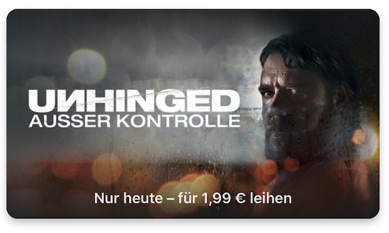 Auch heute hat Apple wieder den sogenannten "Movie Mittwoch" ausgerufen. Dabei wird jeden Mittwoch ein ausgewählter Film aus dem iTunes-Sortiment für 24 Stunden zum Sonderpreis von nur € 1,99 in HD-Qualität zum Leihen angeboten. In dieser Woche handelt es sich dabei um den spannenden Thriller Unhinged - Außer Kontrolle den man zum Sonderpreis von € 1,99 erhält. Nachdem man den Leih-Film geladen hat, kann er innerhalb von 30 Tagen angeschaut werden. Wie immer bei geliehenen Filmen aus dem iTunes Store gilt: Hat man hiermit einmal begonnen, muss man ihn innerhalb von 48 Stunden beenden.