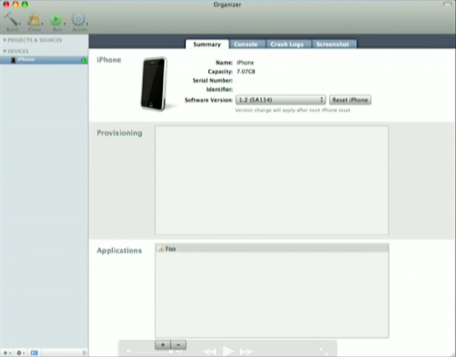In dem am Donnerstag auf der Developer Connection veröffentlichten iPhone-SDK enthaltenen iPhone Simulator lohnt beispielsweise ein Blick in die Einstellungen des simulierten Geräts. Dort wird als Versionsnummer die 1.2 angegeben. Eine Version, die bisher nicht veröffentlicht wurde. Doch nicht nur hier findet sich ein Hinweis auf die neue Version. Apple hat zudem über iTunes verschiedene Videos zur Einführung in die Arbeit mit dem SDK veröffentlicht. In einem dieser Videos (iPhone Development Tools Overview - iTunes Link, erfordert ADC-Account) wird ein iPhone an einen Rechner angeschlossen und im Organizer von Xcode verwaltet. Auch hier lautet die Softwareversion des angeschlossenen iPhone 1.2. Die beiden folgenden Screenshots zeigen dies noch einmal bildlich (zum Vergrößern bitte auf das Bild klicken):