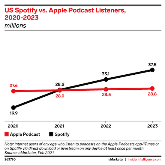 Viele wissen heute gar nicht mehr, dass es einst Apple war, das dem Podcast als Medienformat durch die Integration in iTunes zum Durchbruch verhalf. Seitdem sind iTunes bzw. inzwischen die dedizierte Podcasts-App die Nummer 1 was das Thema Podcast betrifft. Dies könnte sich allerdings bereits in Kürze ändern. So haben die Analysten von eMarketer (via TechCrunch) ermittelt, dass die aktuellen Bemühungen von Spotify dazu führen dürften, dass der schwedische Musikstreamer Apple in Sachen Podcast-Nutzer in Kürze als Platzhirsch ablösen wird. So erwartet man dort, dass Spotify noch in diesem Jahr die Marke von 28,2 Millionen monatlich aktiven Podcast-Hörern knacken wird, während man Apple bei 28 Millionen knapp dahinter sieht. Allerdings erwartet man auch, dass sich diese Entwicklung in den kommenden Jahren fortsetzen wird. Schlimmer noch für Apple: Die eigenen Nutzerzahlen sollen sogar sinken.