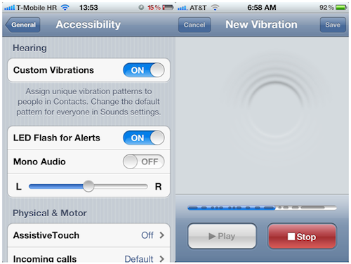 Bestimmte Klingeltöne konnte man bereits in der Vergangenheit einzelnen Personen zuordnen, um diese bei einem Anruf gleich am Klingeln des iPhones erkennen zu können. Ab iOS 5 können nun auch bestimmte Vibrationsmuster vergeben werden. Dies geschieht in den Kontakten an selber Stelle wie auch die Klingeltonzuordnung. Doch damit nicht genug. Die Vibrationsmuster können sogar vollkommen selbst erstellt werden. Hierfür steht im iOS ein extra Vibrations-Composer zur Verfügung. Zu finden ist er in den Einstellungen unter "Bedienungshilfen". An selber Stelle kann man übrigens auch den LED-Blitz des iPhone 4 so umfunktionieren, dass er bei einem eingehenden Anruf auf sich aufmerksam macht. (via 9to5Mac)