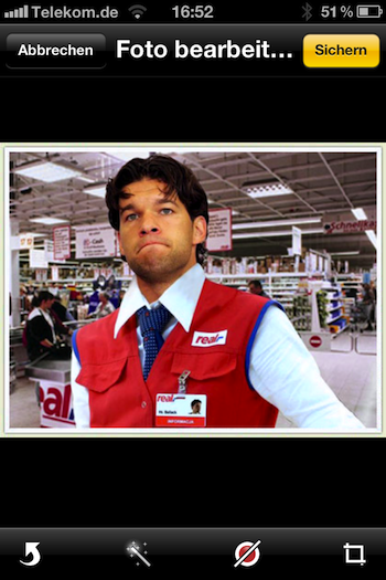 A propos Bearbeitungsfunktion. Diese ist auch in der ersten Beta von iOS 5 bereits verfügbar. Ruft man ein Foto auf, findet sich nun in der oberen Leiste rechts ein "Bearbeiten"-Button über den man in das entsprechende Menü gelangt. Wusstet ihr eigentlich schon, dass Michael Ballack zu Real gewechselt ist?! ;-)