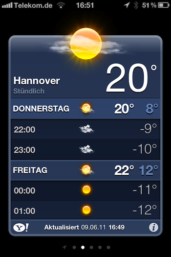 Die Wetter-App hat Apple seit iOS 1 ziemlich stiefmütterlich behandelt und nie verändert. Mit iOS 5 bekommt sie nun nicht nur ein Widget für das Notification Center spendiert, sondern auch eine Lokalisierungsfunktion, um das Wetter am aktuellen Ort anzuzeigen. Und als sei dies noch nicht genug, gibt es oben drauf auch noch (wenn für den jeweiligen Standort verfügbar) stundengenaue Wetterinformationen für die kommenden 48 Stunden. Zu ihnen gelangt man, wenn man einmal auf die Vorhersage tippt.