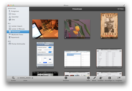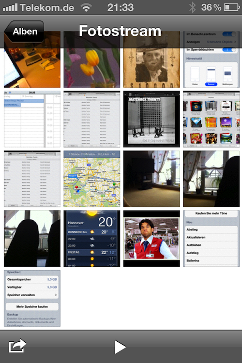 Ebenso übrigens wie Photo Stream. Diese neue Funktion ließ sich bereits recht früh in den Konfigurationsdateien von iOS 4.3 blicken und findet letztlich seinen Weg in iOS 5. Über diese Funktion werden mit dem jeweiligen iOS-Gerät geschossene Fotos auf Wunsch automatisch in die iCloud übertragen und stehen von da aus automatisch auf allen anderen Geräten mit iOS 5 und (nach einem Update) auch unter iPhoto auf dem Mac zur Verfügung.