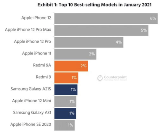 Der Höhenflug des iPhone hält auch zu Beginn des Jahres 2021 weiter an. In einem von Counterpoint Research erstellten Ranking sind sechs der zehn weltweit meistverkauften Smartphones im Januar ein iPhone gewesen. Dazu gehört auch das zuletzt vielgescholetene iPhone 12 mini, welches sich in der Rangliste auf dem achten Platz wiederfindet, sich allerdings auch dem ein Jahr älteren iPhone 11 geschlagen geben muss. Immerhin konnte es sich allerdings noch vor dem iPhone SE 2020 platzieren, das die Top 10 abschließt. Die ersten drei Plätze werden hingegen von iPhone 12, iPhone 12 Pro Max und iPhone 12 Pro belegt, womit Apple seine aktuelle Vormachtstellung einmal mehr deutlich untermauert.