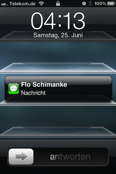 Als weitere Neuerung ist festzustellen, dass die Benachrichtigungen auf dem Lockscreen eine leichte Überarbeitung erfahren haben. Erhält man eine Benachrichtigung und erwacht das iPhone so aus seinem Ruhezustand, wird diese mit einem prominenten Popup auf dem Lockscreen angezeigt. Man hat hier dann die Möglichkeit das Notification Center über einen Wisch vom Uhr-Bereich nach unten aufzurufen. Geht das Display anschließend aus und wieder an, präsentieren sich die Benachrichtigungen wie gewohnt übereinander gestapelt.