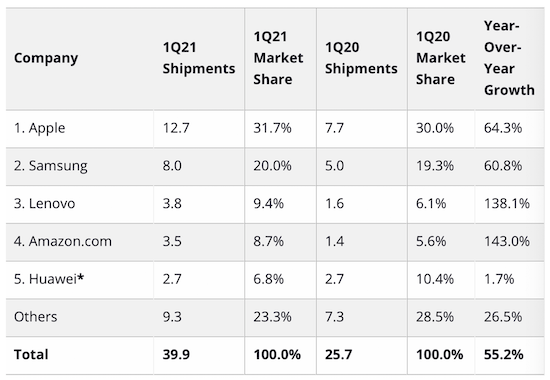 Generell konnte der Tablet-Markt während der Corona-Krise weiter zulegen und wuchs im Jahresvergleich um satte 55,2%. Insgesamt wurden im ersten Quartal des Jahres knapp 40 Millionen Tablets an den Mann gebracht. Apple allein zeichnete dabei mit 12,7 Millionen iPads für die bereits erwähnten 31,7% Marktanteil verantwortlich. Dies bedeutet einen Zuwachs um 64,3% im Jahresvergleich.