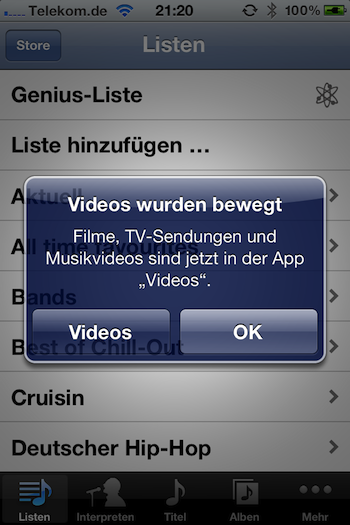 Die Musik-App hat oben links einen Button spendiert bekommen, der direkt in den iTunes Store führt. Bis iOS 4 hatte Apple auf dem iPhone zudem Musik und Videos in einer gemeinsamen iPod-App kombiniert. In iOS 5 wird dies nun aufgesplittet in die Apps "Video" und "Musik". Damit man sich beim Umstieg nicht wundert, präsentiert die Musik-App beim ersten Start den folgenden Hinweis: