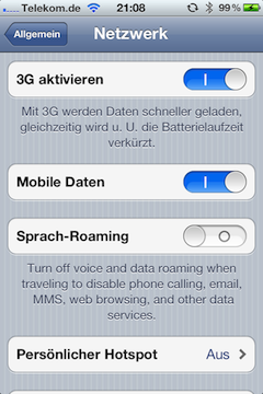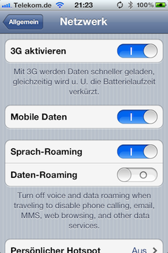 Die bisherige Einstellung für das Deaktivieren des Daten-Roaming ist nun einer deutlich allgemeineren Einstellung namens "Sprach-Roaming" gewichen, die zugleich auch Telefongespräche deaktiviert. Hier wird Apple aus meiner Sicht noch einmal Hand anlegen müssen, da Sprache und Daten in diesem Fall nun wirklich nicht gekoppelt sein dürfen. Korrektur: Die separate Funktion existiert nach wie vor. Sie taucht allerdings erst dann auf, wenn Sprach-Roaming aktiviert ist.