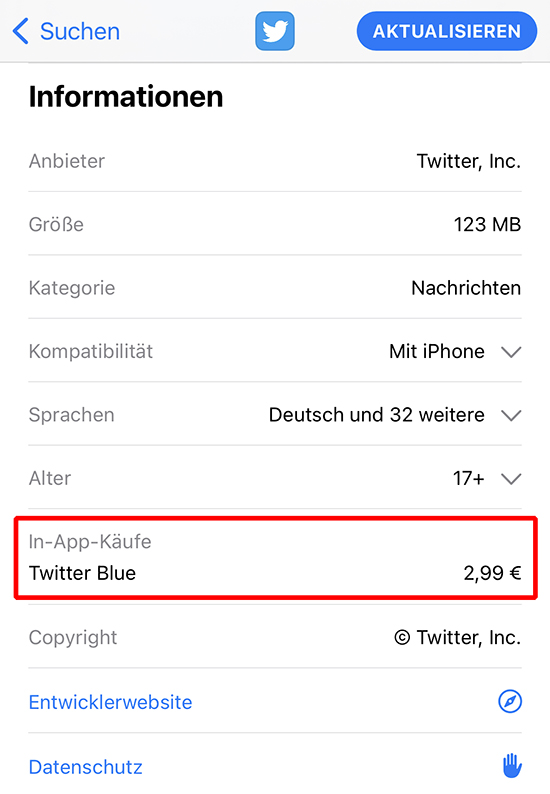 Twitter kündigt versehentlich kostenpflichtige Variante "Twitter Blue" für € 2,99 im AppStore an
