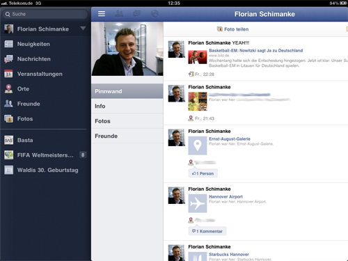 Immer wieder hatte Mark Zuckerberg in der Vergangenheit betont, dass keine Notwendigkeit für eine iPad-Version der Facebook-App bestehe, da man das Tablet nicht als mobiles Gerät ansehe und man deshalb Facebook auch über die normale Webseite nutzen könne. Nun, das sehr wohl ein Bedarf vorhanden ist, sieht man allein schon an den sich hartnäckig in den Top-Platzierungen des AppSTore haltenden Apps von Drittanbietern. Bereits vor einigen Wochen gab es dann auch in der Tat Meldungen, wonach Facebook bereits eine iPad-Version seiner App fertig haben soll und diese bereits internt testet. Wie TechCrunch herausgefunden hat, befindet sich diese sogar bereits auf den Geräten der meisten Facebook-User. Sie steckt nämlich bereits in der aktuellen Version der iPhone-App, ist komplett deutsch lokalisiert und macht auch bereits einen sehr ausgereiften Eindruck (sofern man dies bei einer Facebook-App behaupten kann). Facebook muss eigentlich nur noch den Schalter umlegen und die App somit zur Universal-App machen. Wer ein bisschen experimentiertfreudig ist, kann aber auch schon jetzt die Facebook-App auf seinem iPad nutzen. Hierzu muss man lediglich eine Konfigurationsdatei der App anpassen. Entgegen ersten Meldungen ist hierfür nicht einmal ein Jailbreak nötig. Weiter unten erkläre ich, wie ihr an die App gelangt.