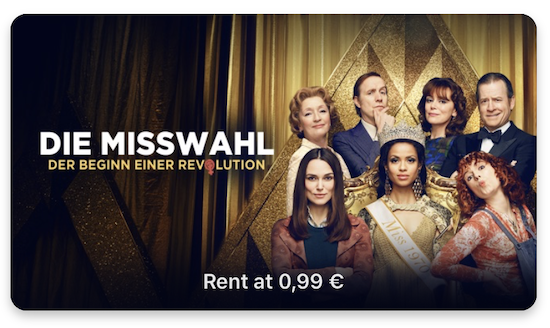 Apple hat zusätzlich zu seinem bereits liebgewonnenen "Movie Mittwoch" nun auch den "Blockbuster fürs Wochenende" ins Leben gerufen. Dabei wird jedes Wochenende ein ausgewählter Film aus dem iTunes-Sortiment für 24 Stunden zum Sonderpreis von nur € 0,99 in HD-Qualität zum Leihen angeboten. In dieser Woche handelt es sich um die Komödie Die Misswahl - Der Beginn einer Revolution mit Keira Knightley, den man zum Sonderpreis von € 0,99 erhält. Nachdem man den Leih-Film geladen hat, kann er innerhalb von 30 Tagen angeschaut werden. Wie immer bei geliehenen Filmen aus dem iTunes Store gilt: Hat man hiermit einmal begonnen, muss man ihn innerhalb von 48 Stunden beenden.