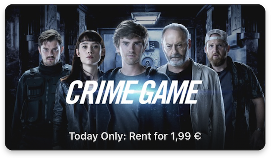 Auch heute hat Apple wieder den sogenannten "Movie Mittwoch" ausgerufen. Dabei wird jeden Mittwoch ein ausgewählter Film aus dem iTunes-Sortiment für 24 Stunden zum Sonderpreis von nur € 1,99 in HD-Qualität zum Leihen angeboten. In dieser Woche handelt es sich dabei um den Thriller Crime Game, den man zum Sonderpreis von € 1,99 erhält. Nachdem man den Leih-Film geladen hat, kann er innerhalb von 30 Tagen angeschaut werden. Wie immer bei geliehenen Filmen aus dem iTunes Store gilt: Hat man hiermit einmal begonnen, muss man ihn innerhalb von 48 Stunden beenden.