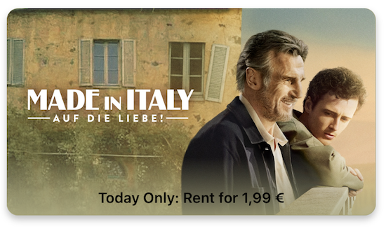 Auch heute hat Apple wieder den sogenannten "Movie Mittwoch" ausgerufen. Dabei wird jeden Mittwoch ein ausgewählter Film aus dem iTunes-Sortiment für 24 Stunden zum Sonderpreis von nur € 1,99 in HD-Qualität zum Leihen angeboten. In dieser Woche handelt es sich dabei um das Liebesdrama Made in Italy - Auf die Liebe mit Liam Neeson, das man zum Sonderpreis von € 1,99 erhält. Nachdem man den Leih-Film geladen hat, kann er innerhalb von 30 Tagen angeschaut werden. Wie immer bei geliehenen Filmen aus dem iTunes Store gilt: Hat man hiermit einmal begonnen, muss man ihn innerhalb von 48 Stunden beenden.