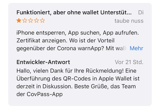 Zuletzt gab es auf Basis von Rückmeldungen der Entwickler auf AppStore-Rezensionen Hoffnung, dass hieran evtl. doch noch gearbeitet werden könnte. So hieß es dort, "eine Überführung des QR-Codes in Apple Wallet ist derzeit in Diskussion".
