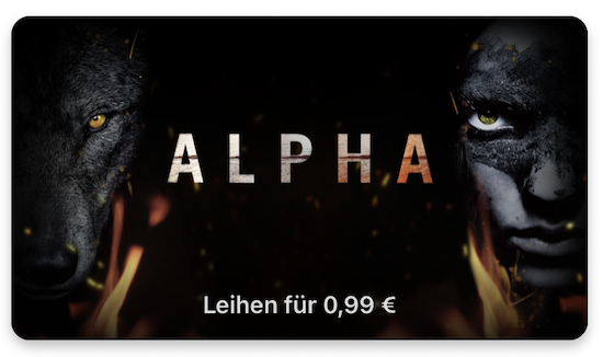 Apple hat zusätzlich zu seinem bereits liebgewonnenen "Movie Mittwoch" nun auch den "Blockbuster fürs Wochenende" ins Leben gerufen. Dabei wird jedes Wochenende ein ausgewählter Film aus dem iTunes-Sortiment für 24 Stunden zum Sonderpreis von nur € 0,99 in HD-Qualität zum Leihen angeboten. In dieser Woche handelt es sich um das Fantasy-Drama Alpha, das man zum Sonderpreis von € 0,99 erhält. Nachdem man den Leih-Film geladen hat, kann er innerhalb von 30 Tagen angeschaut werden. Wie immer bei geliehenen Filmen aus dem iTunes Store gilt: Hat man hiermit einmal begonnen, muss man ihn innerhalb von 48 Stunden beenden.