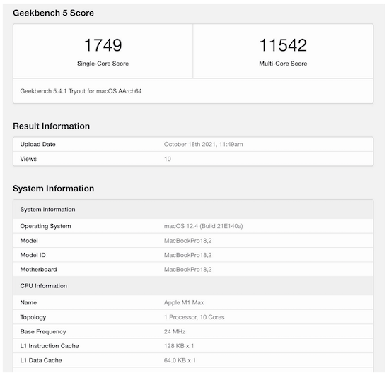 Inzwischen sind auch erste Benchmarks in der Geekbench-Datenbank aufgetaucht, die mutmaßlich dem neuen M1 Max Chip mit seiner 10-Kern CPU und einer 32-Kern GPU zuzuordnen sind. Das Gerät kommt dort auf einen Single-Core Wert von 1.749 Punkten und einen Multi-Core Wert von 11.542 Punkten, was der doppelten Punktzahl der Multi-Core Leistung des M1?-Chip in einem 13" MacBook Pro entspricht. Weitere Geekbench-Ergebnisse, auch zu den anderen Konfigurationen des neuen MacBook Pro sind in den kommenden Tagen zu erwarten.