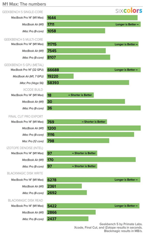 Am morgigen Dienstag gehen die neuen MacBook Pro offiziell in den Verkauf und werden auch an die ersten Frühbesteller von vergangener Woche ausgeliefert. Passend dazu hat Apple nun das Embargo für die Reviews zu den neuen Geräten aufgehoben, die sich seither ihren Weg ins Netz bahnen. Da es sich um das größte Update der Apple-Notebooks seit mehreren Jahren handelt, waren die Vorstellung und die Reviews natürlich mit großer Spannung erwartet worden. Da Apple beide neuen Modelle erstmals mit einem M1 Pro/Max Prozessor ausgestattet hat, stand bei vielen Testern natürlich unter anderem die Performance im Fokus. Und alle zeigten sich letzten Endes beeindruckt von der Leistungsfähigkeit der Geräte. Die Kollegen von MobileSyrup konnten beispielsweise zu keiner Zeit irgendwelche Verzögerungen ausmachen, egal womit sie den M1 Pro Chip malträtierten. Six Colors hat zudem die nachfolgende Grafik zu den Leistungsmerkmalen zusammengestellt: