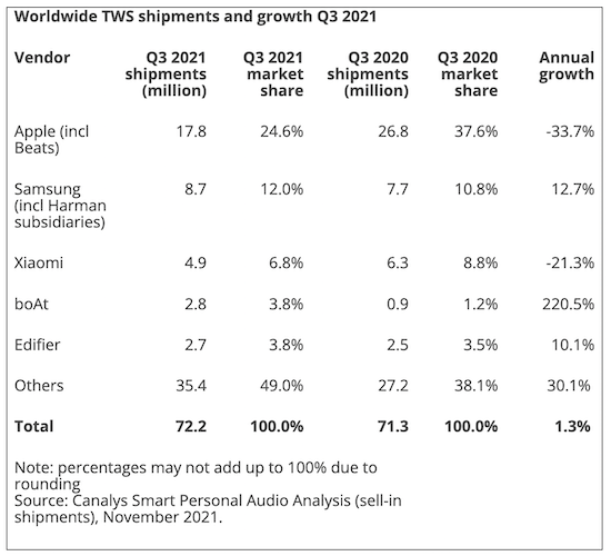 Auf die zweite Generation der AirPods Pro wird man letzten Erkenntnissen zufolge wohl noch bis zum Herbst kommenden Jahres warten müssen. Doch auch so dominiert Apple auch weiterhin mit seinen AirPods und Beats den Markt der sogenannten True Wireless Stereo (TWS) Kopfhörer. Dies belegen zumindest aktuelle Zahlen der Analysten von Canalys, die zwar vermelden, dass die globalen AirPods-Verkäufe im dritten Quartal um ein Drittel zurückgingen, dies jedoch nichts an der Dominanz von Apple auf diesem Markt ändere. Den Rückgang von einem Marktanteil von 37,6% auf 24,6% im Jahresvergleich ist den Analysten zufolge wohl vor allem darauf zurückzuführen, dass die Kunden auf die dritte Generation der AirPods gewartet haben, deren Vorstellung jedoch erst in das vierte Quartal fiel. Mit 17,8 Millionen verkauften Einheiten und dem genannten Marktanteil liegt man jedoch nach wie vor deutlich an der Spitze des Marktes. Auf dem zweiten Rang folgt Samsung mit einem Respektsabstand und einem Anteil von 12%. Für das aktuelle Quartal erwarten die Analysten, dass sich das Blatt wieder wenden wird. Auch hier dann wohl der Grund: Die dritte Generation der AirPods, die zufälligerweise genau rechtzeitig für das Weihnachtsgeschäft auf den Markt kamen.