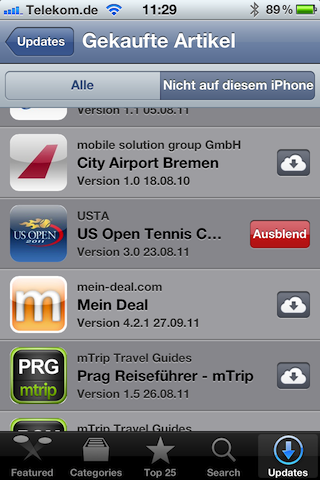alle jemals erworbenen Artikel aufgetaucht sind. Ihr könnt euch sicher einigermaßen vorstellen, wie viele das in meinem Fall gewesen sind. Von Übersichtlichkeit also keine Spur. Inzwischen ist es jedoch möglich, einzelne Apps aus dieser Ansicht auzublenden. Dies funktioniert sowohl auf den iOS-Geräten (seitlich über den Artikel wischen), als auch über iTunes am Rechner (im Bereich "Gekaufte Artikel"; Maus über das Icon und anschließend das erscheinende X anklicken). Bei vielen Apps hat es durchaus einen Grund, warum man sie mal gelöscht hat, nun kann man sie also auch aus der iCloud-Übersicht ausblenden. Auch der Mac AppStore verfügt unter OS X 10.7.2 über eine solche Funktion. Doch Apple hat sogar noch weiter gedacht über die iTunes-Account-Einstellungen kann man auch die ausgeblendeten Artikel bei Bedarf wieder zurück holen. Und selbstverständlich können auch die ausgeblendeten Artikel nach wie vor erneut kostenlos über den Store geladen werden. Die Übersicht ist nun also wiederhergestellt. Vielen Dank, Apple!